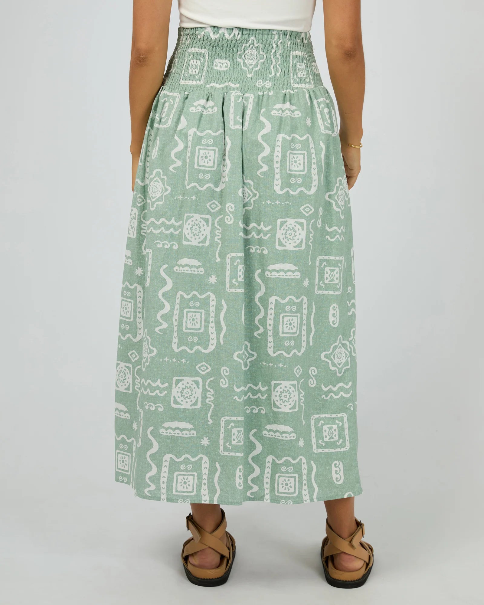 The Lucia Maxi Skirt is all about easy elegance, featuring a breezy cotton flax blend in sage green with a soft white organic pattern. A shirred waistband and gathered waist create a flattering, flowy silhouette perfect for warm days. Pair it with a simple tank or the matching Lucia Top for an effortlessly coordinated spring look.