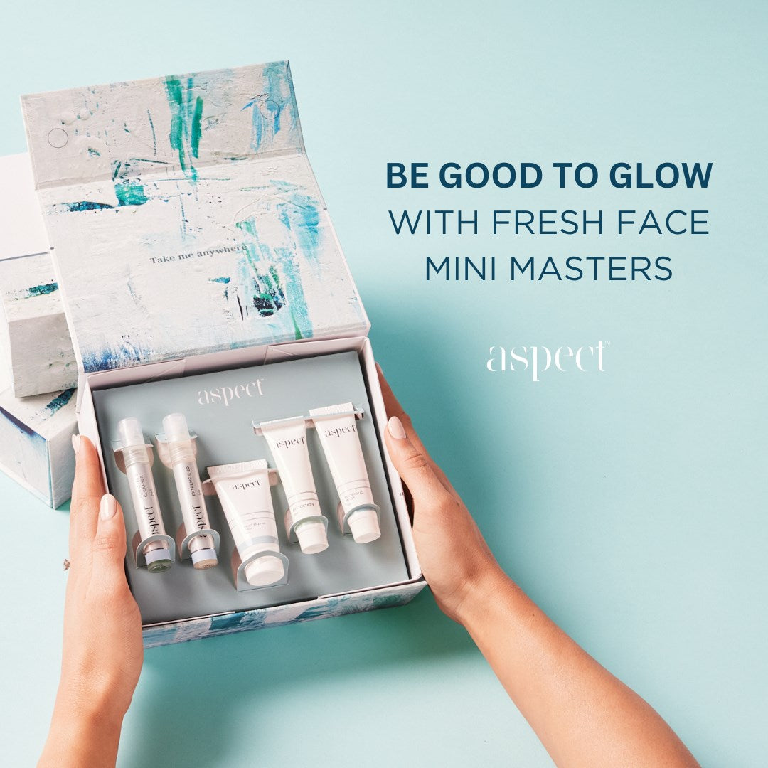 You’ll be “Good to glow” with these fresh face mini masters. No need to sacrifice your skincare routine when you’re away. This limited-edition kit is your ultimate travel companion, filled with premium skincare essentials that are perfect for jet-setters or those starting their Aspect skincare journey.