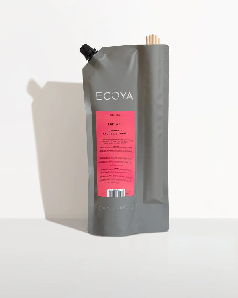 Refill your ECOYA diffuser with your favourite ECOYA fragrance, now available in 200mL refill pouches. Available in our most loved fragrances Sweet Pea & Jasmine, French Pear, Guava & Lychee Sorbet and Lotus Flower. The refill also comes with a new set of natural reed sticks.