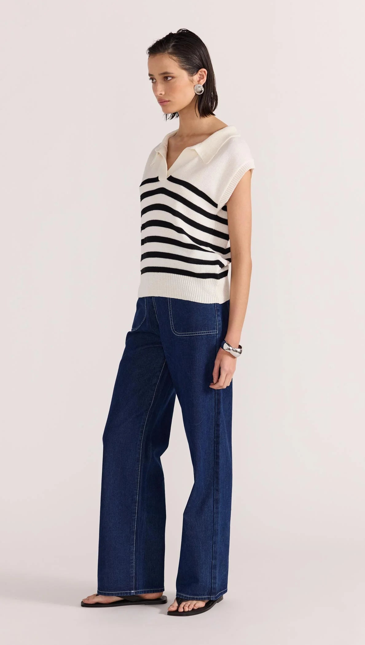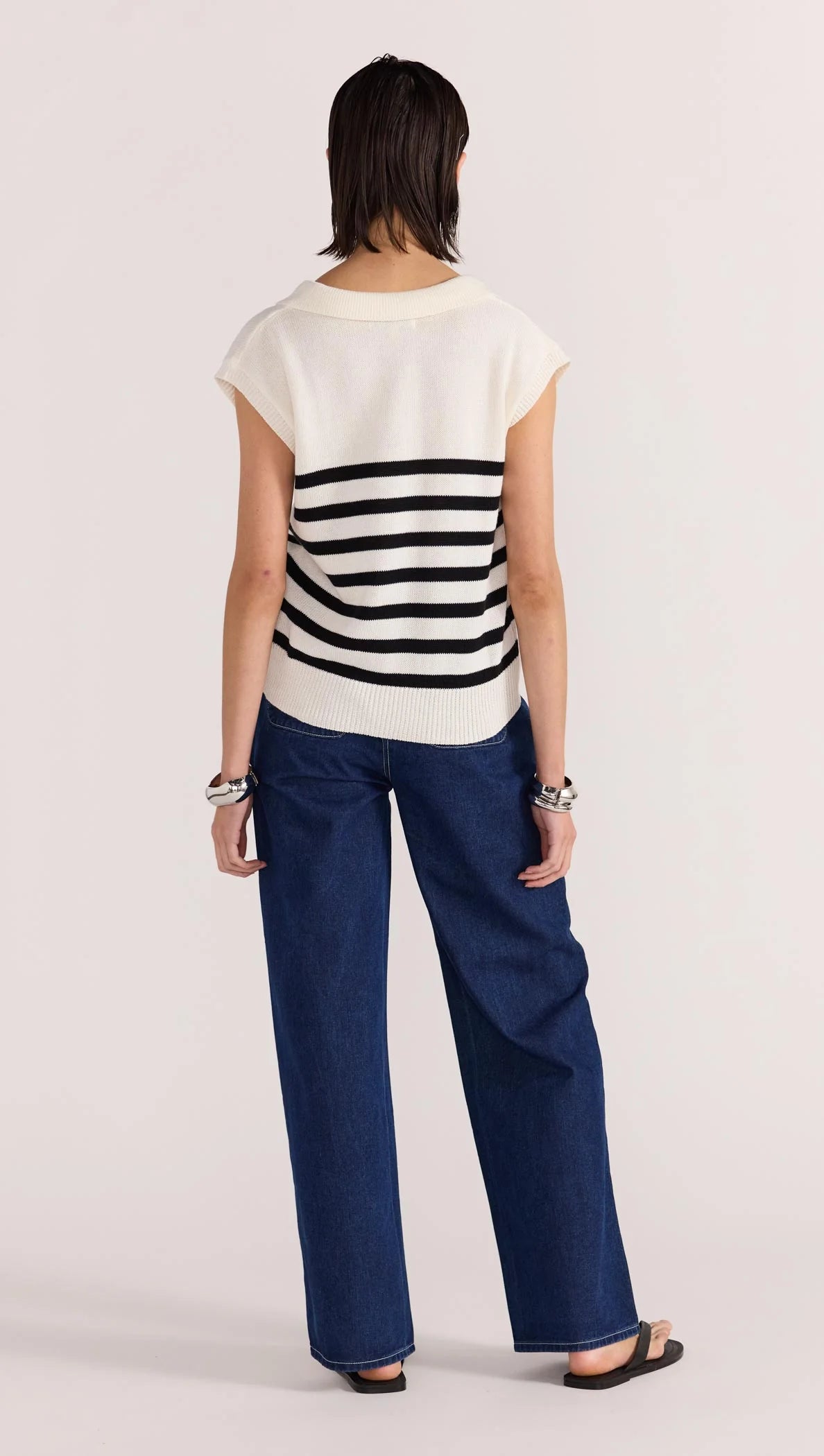 The Remi Stripe Polo Knit by Staple the Label features a stretch knit fabrication, and a navy on white striped design. Style with the Augusta High Waist Jeans to complete the look.